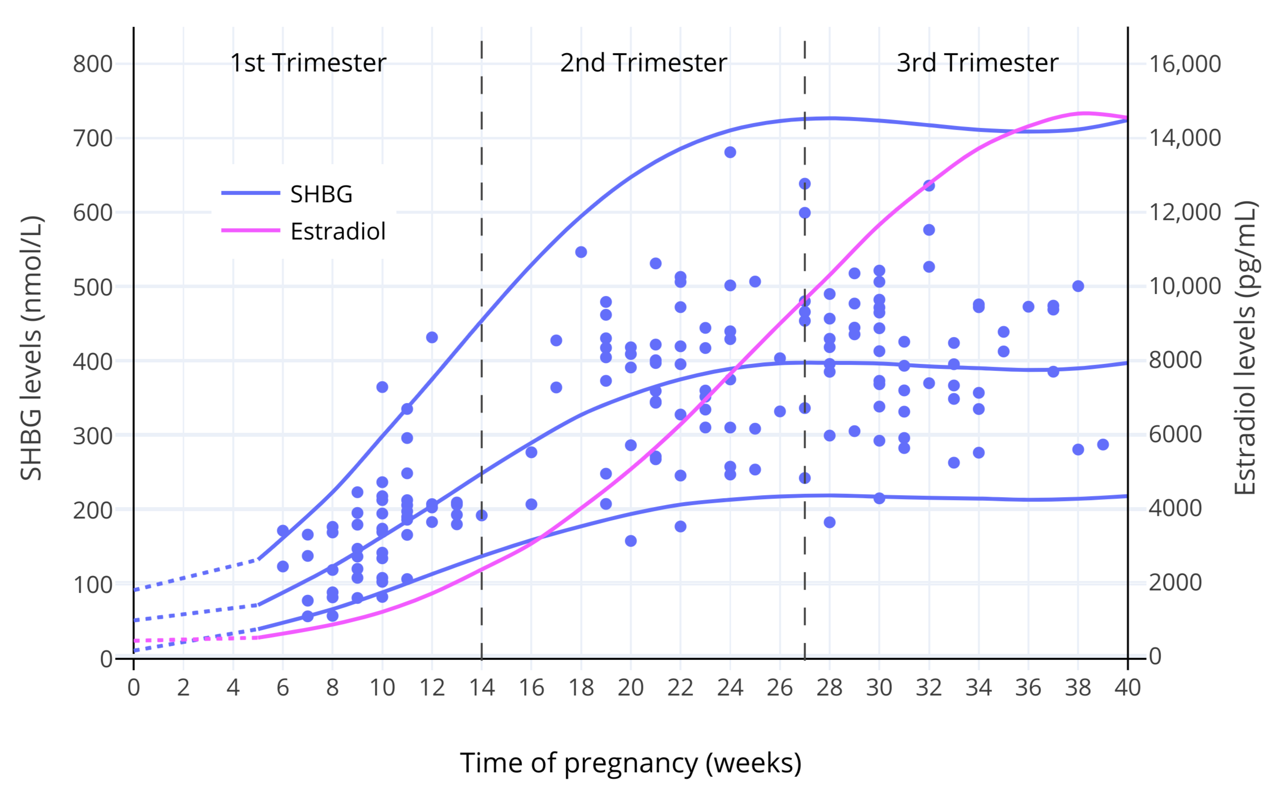 The influence of estradiol on SHBG levels is most relevant to pregnancy, when estradiol levels increase to far higher levels than usual. In late pregnancy, estradiol levels are generally around 15,000 to 25,000 pg/mL on average (Graphs; Troisi et al., 2003; Adamcová et al., 2018). These estradiol levels are on the order of 100-fold higher than normal menstrual cycle levels. In parallel with the massive increases in estradiol levels, SHBG levels increase by about 5- to 10-fold by late pregnancy (Anderson, 1974; Hammond, 2017). The dose–response curve of estrogens on SHBG production shows saturation, with most of the increase in SHBG levels happening at lower estradiol levels as well as limits to how much SHBG levels can be increased (Mean, Pellaton, & Magrini, 1977; O’Leary et al., 1991; Kerlan et al., 1994; Kuhl, 1999). The graphs below show SHBG levels throughout pregnancy.