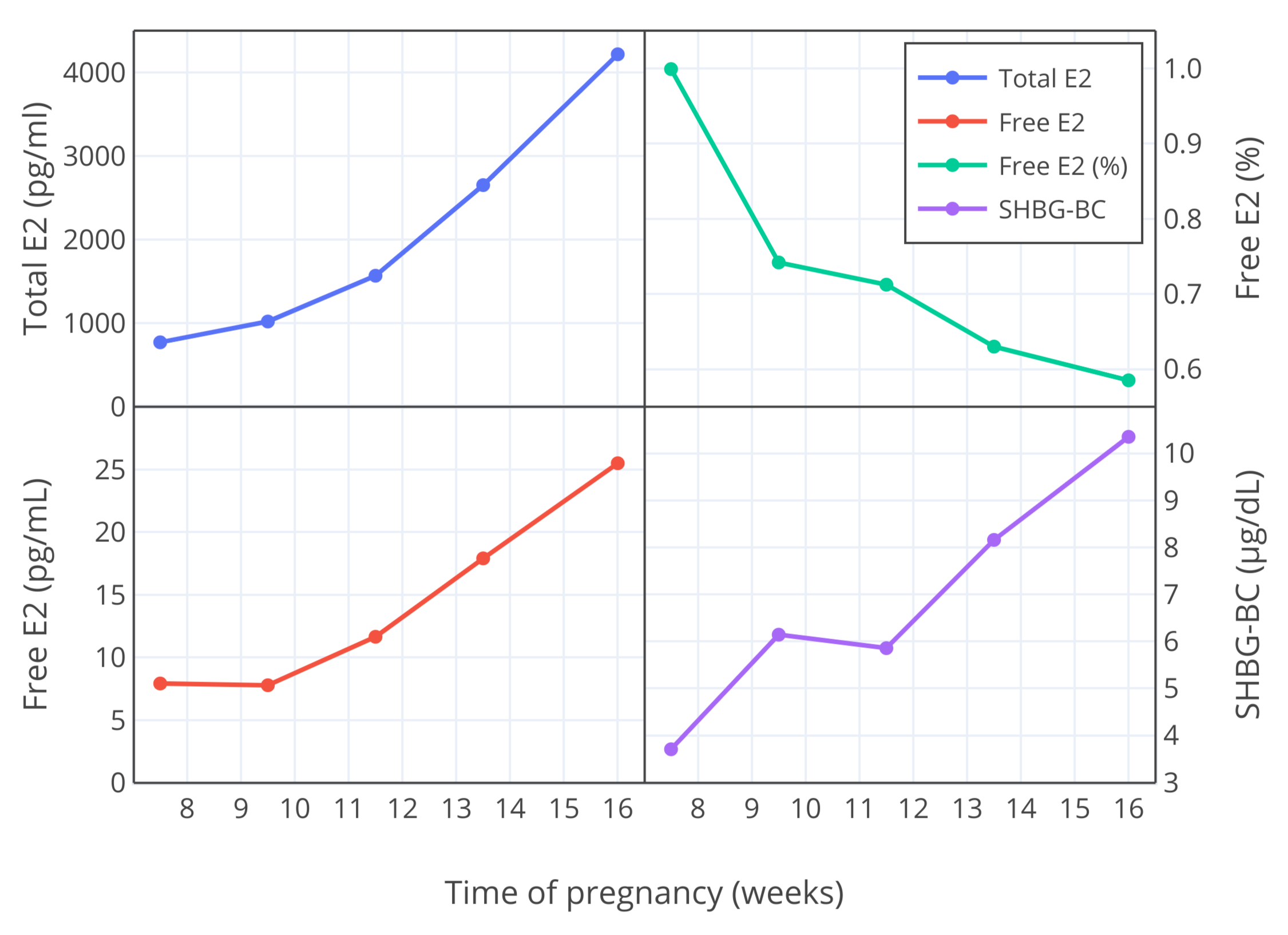 | Figure 3: Changes in total and free estradiol levels (pg/mL), free estradiol fraction (%), and SHBG binding capacity (μg/dL) during weeks 7 to 16 of pregnancy in women (Bernstein et al., 1986). |